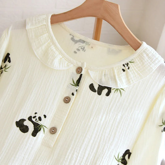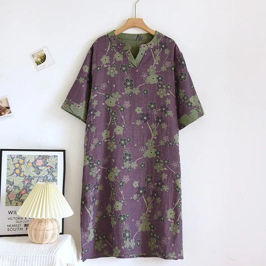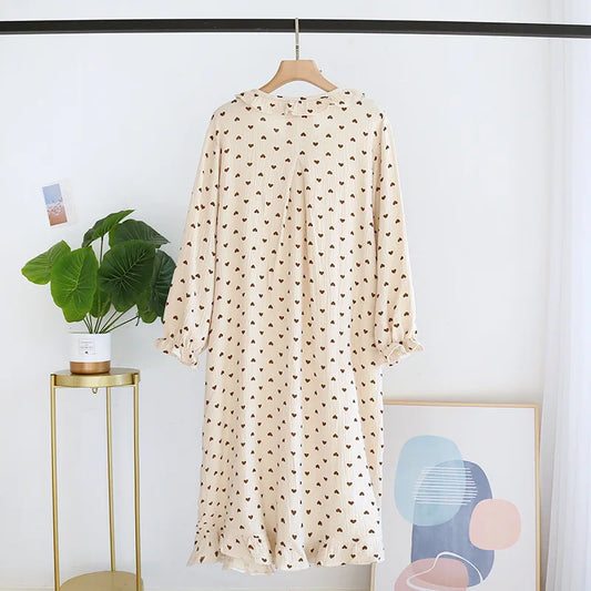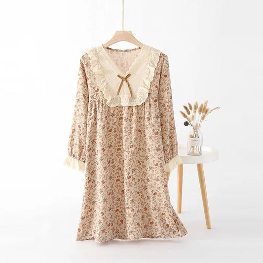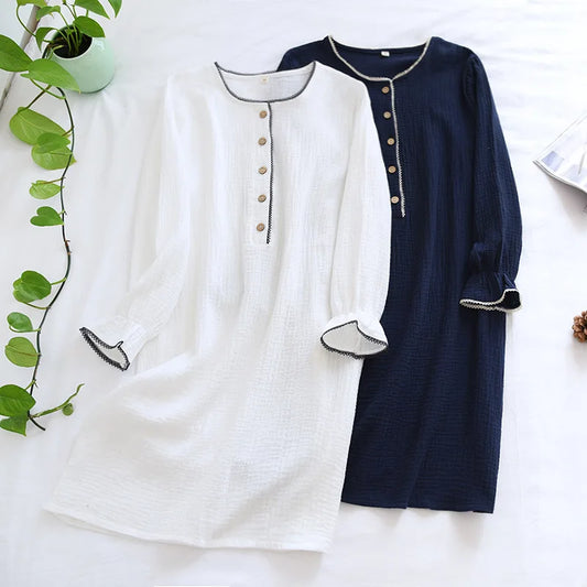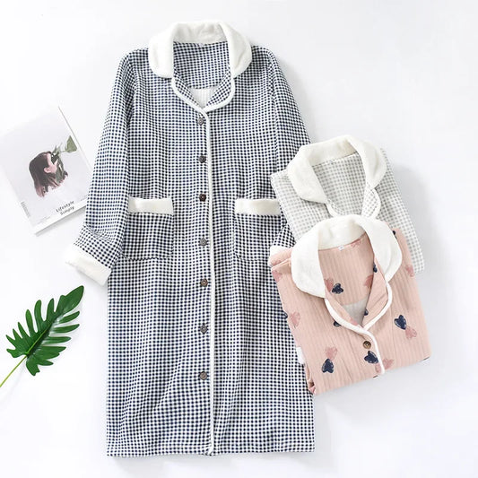 Simple Plaid Cotton Gauze Long-Sleeve Nightgown