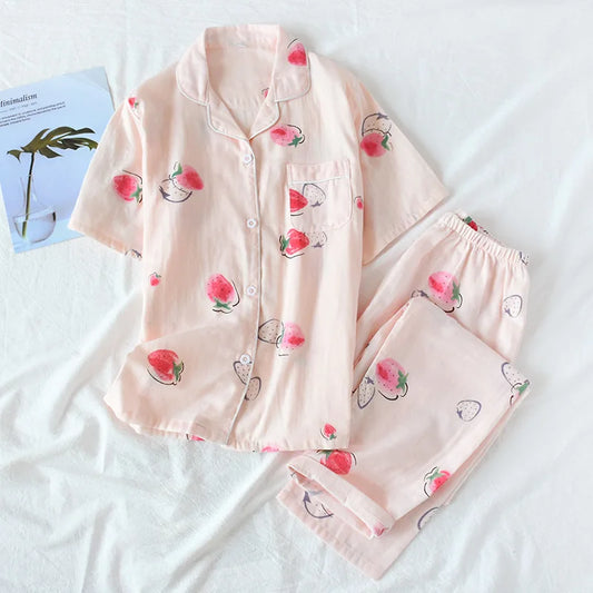 Strawberry Cotton Gauze Short Sleeve Pants Pajama Set